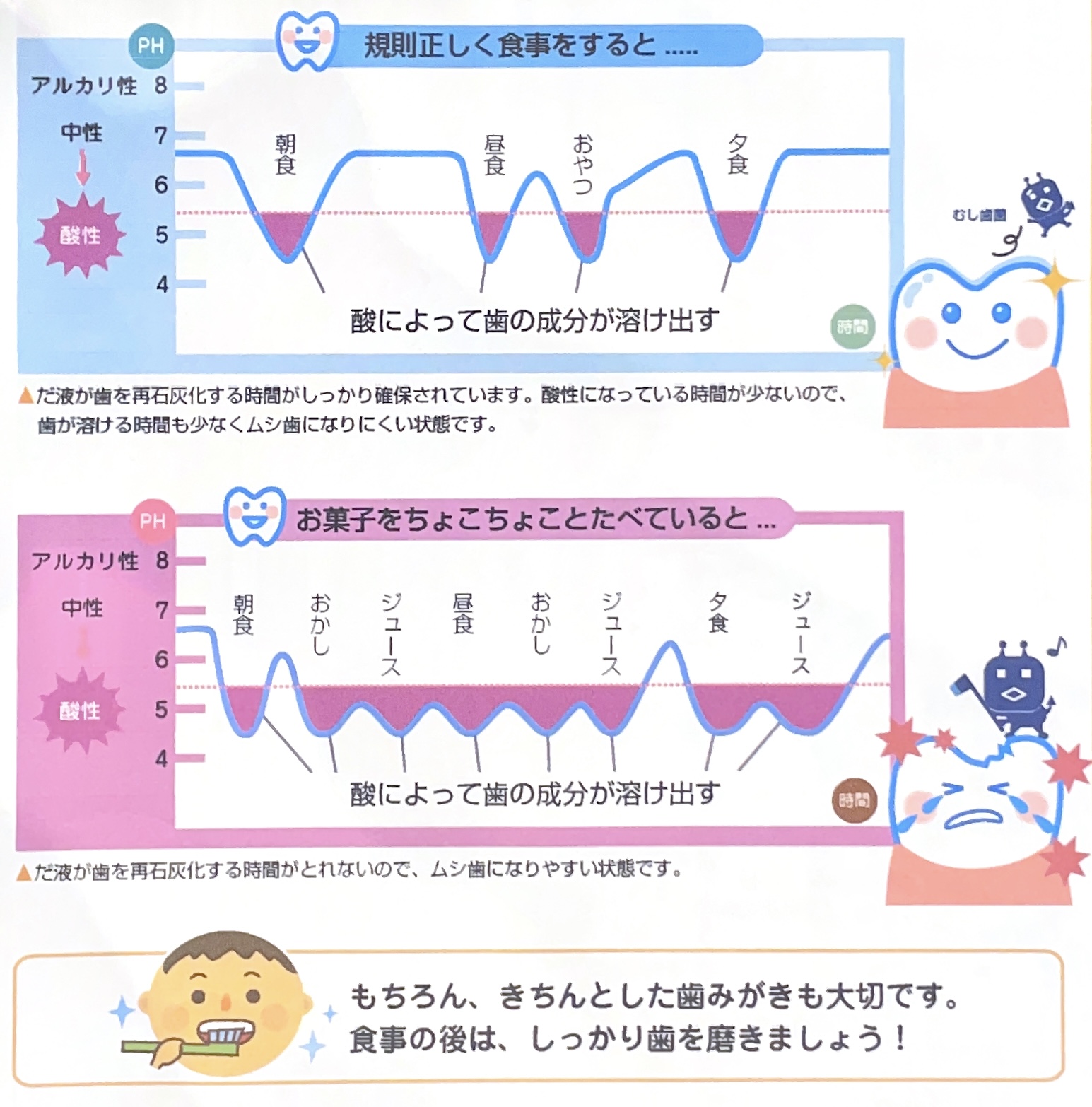お菓子を食べた後、口の中では虫歯菌が糖をエサにして酸を出し、歯を溶かすという反応が起きてます。特にキャラメルやグミなどの歯にくっつきやすいお菓子は、口の中でに糖が長く残るため、虫歯リスクが上がります。